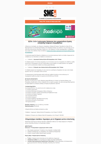Το SMEs Daily είναι το καθημερινό δωρεάν ψηφιακό newsletter, που παρέχει στις μικρομεσαίες επιχειρήσεις τις απαραίτητες πληροφορίες και λύσεις, με στόχο να βοηθήσει στην ενίσχυση της ανταγωνιστικότητας τους.